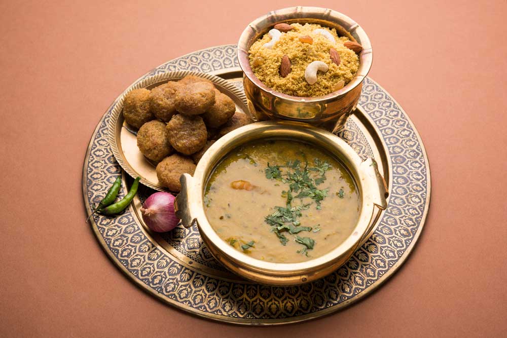 With its crunchy baati, spicy dal, and sweet churma, the entire dish is a deft blend of flavours and textures. It is associated with celebrations and in spite of the roughness of the ingredients and cooking technique, yields a delicious and homely dinner. That’s why this three-in-one feast is the ideal comfort dish in Rajasthan. After being crushed and dipped in the dal, the baatis become softer and absorb the flavour. You can break the baatis and serve them dipped in dal, with a squeeze of lime and some fresh coriander garnished on top. Usually consumed as a dessert after the savoury dal baati, the churma is a sweet meal. Some people prefer to eat it with dal baati. A cool bowl of yoghurt salad or raita might be served alongside the meal to enhance its flavours, as can a side dish of tart pickles.